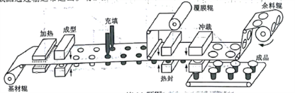 14.如图所示是用于饮料封装的自动化生产线。余料辊间歇运动,余料辊停顿时完成成型、充填、热封、冲裁等环节的工作;各环节完成后余料辊继续转动,并牵引基材、覆膜向前移动设定长度。成品通过输送带送出。请根据示意图和描述,完成以下任务: