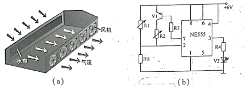 17.如图所示是车间降温原理示意图及小明设计的温度控制试验电路。当车间温度高于上限时V2发光,表示风机和水泵运行,水泵工作产生水帘,风机排出热空气吸入经水帘冷却的空气,使车间降温。当车间温度低于下限时V2熄灭,表示风机和水泵停止运行。请完成以下任务: