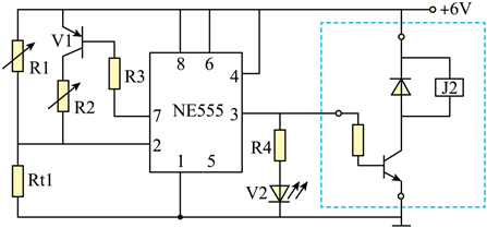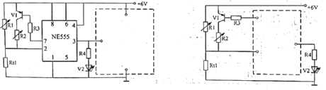 (3)小明准备用1个继电器同时控制风机和水泵工作,用555电路3脚的输出信号通过三极管驱动继电器,当继电器吸合时风机和水泵运行。现有继电器J1(线圈额定电压3V)、继电器J2(线圈额定电压6V)、继电器J3(线圈额定电压9V)、电阻器、二极管、NPN三极管、PNP三极管各1个,请选择4个合适的元器件在虚线框内完成电路设计,要求三极管采用共发射极接法,并标出所选继电器的编号;