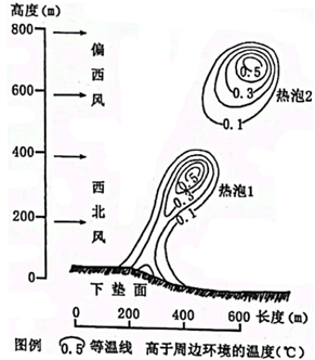 当空气经过较暖的下垫面时,底部的大气增温形成比周边温度高的“热泡”,并不断向上运动,这是一切对流现象的基础。“热泡”超过凝结高度就会形成云层,海面上的云层在夜间常常会发生强烈对流,形成雷雨天气。下图为甲地下垫面附近“热泡”上升运动示意图。完成24、25题。