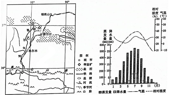材料二 图1为察尔汗及周边地区略图,图2为察尔汗多年月平均气象要素图。