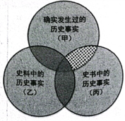 22.关于“历史事实”,学界有多种见解。有学者将"历史事实”范畴区分为三个不同的层次:确实发生过的历史事实(圆圈甲);史料中的历史事实,即历史本体的残存和遗迹(圆圈乙);史书中的历史事实(圆圈丙),并据此绘制了表示“历史事实”不同构成的示意图。下列项中,对图示中网格部分的“历史事实”,解读正确的是