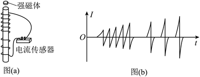8. 一有机玻璃管竖直放在水平地面上,管上有漆包线绕成的线圈,线圈的两端与电流传感器相连,线圈在玻璃管上部的5匝均匀分布,下部的3匝也均匀分布,下部相邻两匝间的距离大于上部相邻两匝间的距离。如图(a)所示。现让一个很小的强磁体在玻璃管内沿轴线从上端口由静止下落,电流传感器测得线圈中电流I随时间t的变化如图(b)所示。则( )