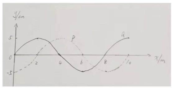 , 所以P 波刚好传到10m 处, Q 波刚好 传到原点处,根据“上坡下振,下坡上振”法,可画出此时的波形图如图所示。