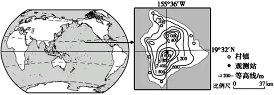 夏威夷岛人口密度低,以第三产业为主。该岛海拔2400米以上区域常年受副热带高压控制,1800米以下区城受信风控制。1958年以来,科学家在夏威夷岛上的观测站对大气二氧化碳浓度开展观测,是全球最早对大气二氧化碳浓度进行持续观测的站点。观测得到的数据被普遍认为能够反映全球大气二氧化碳的平均浓度变化,为科学认识气候变化提供了重要依据。下图示意夏威夷岛位置与地形。