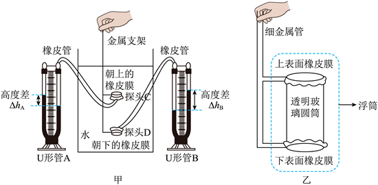 (3)①小莉受双探头压强计原理的启发制作出如图乙的器材(细金属管与浮筒相通),她将浮筒漂浮在水中后再使其竖直向下移动,感受到细金属管对手的作用力越来越______;浮筒竖直浸没水中后,仔细观察其表面橡皮膜形变更明显,从而分析出______产生的原因;