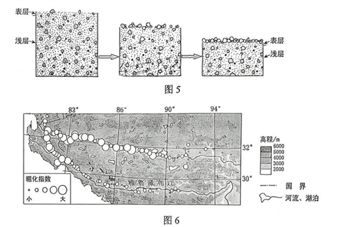 (2)分布特征:北大南小,西大东小。原因:南部和东部受到一定夏季风影响,降水较多,植被较为茂密,风力侵蚀作用较弱,风蚀粗化程度较小;北部和西部受高原内部冬季风影响较为强烈,降水较少,植被以高寒草甸草原和荒漠为主,风力侵蚀作用强烈,风蚀粗化程度较大。