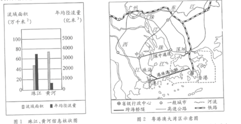 【答案】(1) ①. 小 ②. 大 ③. 珠江流经季风气候区,降雨多,河流水量大;黄河主要流经半干旱、半湿润地区,降水少