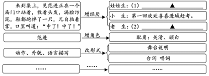 探究步骤 | (1)阅读剧本后推断:关清、顾白和范进的关系是________,依据是________。 (2)联系剧本内容和探究资料,结合配角关清、顾白姓名的深意,分析汪曾祺增设这两个配角的意图。 | (3)(甲)处唱词空缺处需要补一句唱词。根据语境,从下列选项中选择你认为最恰当的一项,并结合唱词内容和形式说明理由。 A.我头顶大官帽,拎着枣儿糕 B.我摆也么摆,摇也么摇 C.我左看看,右看看 我选 ,理由: (4)联系《儒林外史》和探究资料,结合(乙)处唱词,分析汪曾祺改编范进形象的意图。 |