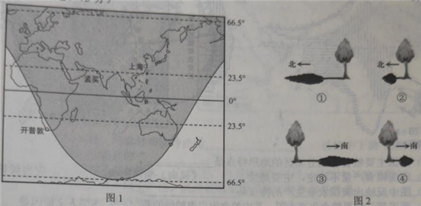 31.某乘客乘飞机从开普敦经停孟买飞往上海,图1为“航班起飞时刻全球部分地区昼夜状况示意图”,图中阴影部分表示黑夜,图2为“上海某日正午树影情况示意图”。读图回答下列问题。(5分)