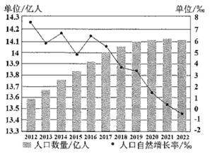 近十年我国人口发展出现一些变化。读2012-2022年中国人口数量和人口自然增长率变化图,完成问题。
