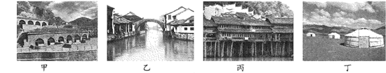甲—蒙古包乙—江南民居丙—吊脚楼丁—窑洞
