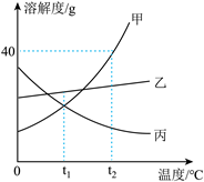 B、将甲、乙、丙的饱和溶液由t2℃降温到t1℃,甲、乙溶解度减小,溶液中有晶体析出,但溶液仍饱和,乙溶解度增大,溶液由饱和变为不饱和溶液,但溶质质量分数不变,又由于t1℃乙的溶解度>t1℃甲的溶解度>t2℃丙的溶解度,而饱和溶液的溶质质量分数=
