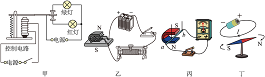 A. 如图甲所示,当闭合开关后电路中的绿灯亮
