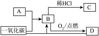 19. A、B、C、D四种物质均含同一种金属元素,A为赤铁矿的主要成分,B为单质。它们之间的转化关系如下图所示(图中“—”表示物质间能相互发生反应,“→”表示物质间能发生一步转化,部分物质和反应条件已略去)。