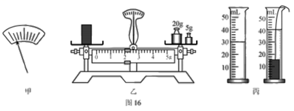 ①把天平放在水平桌面上,将游码移至标尺左端零刻线处,发现指针在分度盘上的位置如图16甲所示,为使横梁平衡应将平衡螺母向______调节(选填“左”或“右”);