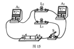 19.在探究串、并联电路中电流的规律时,做了如图15所示的实验。闭合开关后,电流表A1、A2的示数分别为0.5A和0.3A,则通过小灯泡