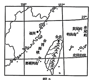 台湾岛及其附属岛屿自古以来就是中国的神圣领土。台湾省“太空中心”致力于研究卫星和太空技术,台湾省解放后将摆脱西方国家的控制,为祖国航天事业的发展贡献力量。图3为台湾省地理位置示意图,据此完成22~23题。