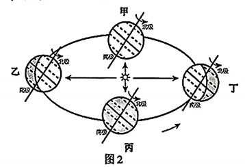 北京时间2023年2月10日00时16分,我国神舟十五号(由酒泉基地发射)航天员费俊龙、邓清明、张陆经过约7小时的出舱活动,全部完成出舱任务。图2是“地球公转示意图”,甲、乙、丙、丁表示“二分二至”,读图回答8~10题。