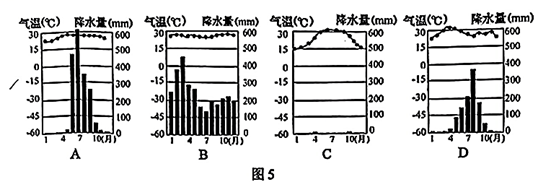 (4)③所在的国家是 ,该国主要的气候类型为 ,其气温曲线和降水柱状图为图5中的 (填字母),该气候类型容易造成的自然灾害是 。