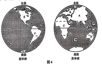 41.读图4“东西半球简图”和图5“四种气候类型的气温-降水统计图”,完成下列题目。(每空1分,共15分)