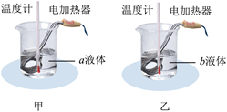 22. 某实验小组用如图所示的实验装置比较a、b两种液体的吸热情况,甲、乙两装置使用规格相同的电加热器、玻璃杯、温度计,两玻璃杯内的液体质量和初温都相同。实验中记录的数据如下表: