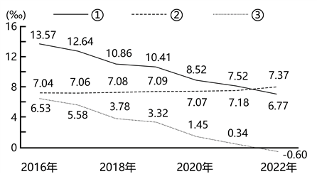 人口出生率减去人口死亡率等于人口自然增长率。下图为2016~2022年我国人口出生率,人口死亡率和人口自然增长率变化图。据此完成下面小题。