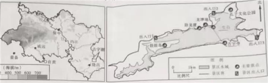 17. 隆昌市舌宇湖是20世纪70年代修建的中型人工湖泊,面积约5.4平方千米,水库容量5600万立方米,为隆昌市主要水源,湖中半岛、岛屿是候鸟栖息的乐园。下图为内江市地形图和古宇湖风景名胜区示意图。据此完成下列要求。