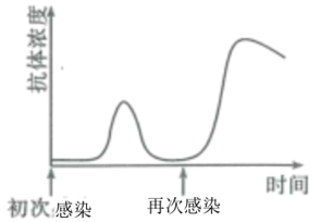 【分析】分析曲线图可知,机体初次感染后会产生抗体,但数量少,持续时间短。再次感染同一种病毒后机体产生大量抗体,且持续时间长。