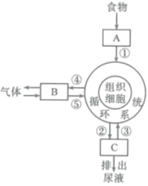【分析】A是消化系统,B是呼吸系统,C是泌尿系统,①是吸收,②是过滤作用,③是重吸收作用,④是二氧化碳,⑤是氧气。