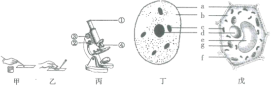 21. 下图中,甲、乙表示“制作人的口腔上皮细胞临时装片或制作洋葱鳞片叶内表皮细胞临时装片”实验的部分操作步骤;图丙表示显微镜的结构;图丁、戊分别为动物细胞、植物细胞结构的模式图。回答下列问题: