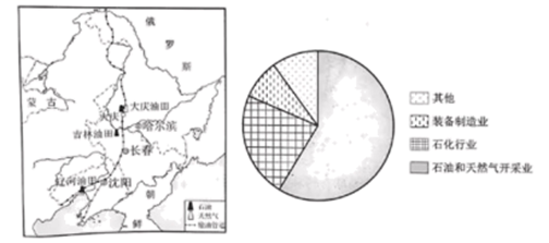 材料一“为了国家不贫血,我们的血已经备下了,烧热了……宁可少活二十年,拼死拼活也要拿下大油田。”(引自电影《铁人王进喜》)20世纪60年代大庆油田的建成投产,使我国摆脱了贫油国的帽子。左图为东北三省简图,右图为大庆市的工业结构(2019年)示意图。