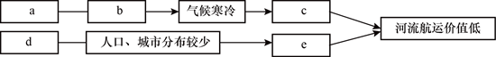 (4)以下框图是俄罗斯西伯利亚地区河流航运价值低的原因分析,请将图中所缺内容从a到e的顺序补全_________(填序号)。①纬度高 ②河流封冻期长 ③自然原因 ④航运需求小 ⑤社会经济原因