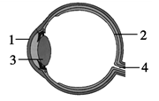 【详解】图中眼球的结构名称为:1是角膜、2是视网膜、3是晶状体、4是视神经。