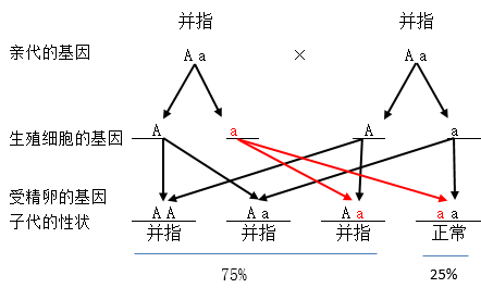 I代父母都是并指,而II代3为正常,子代个体出现了亲代没有的性状正常不并指,因此新出现的性状为隐性性状,故并指为显性性状,亲代的基因组成为杂合体Aa。个体3正常,性状为隐性性状,由隐性基因控制,故其基因组成为aa。据此可知,亲代I中的1和2基因型都是Aa,其遗传图解如下:
