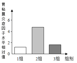 ①实验中,1组(不灌胃幽门螺旋杆菌)和2组(灌胃幽门螺旋杆菌)对比,实验的变量幽门螺旋杆菌(或是否灌胃幽门螺旋杆菌)。根据柱形图“2组的胃黏膜炎症因子水平相对值最高,炎症因子水平相对值越高,炎症越严重”可得到实验结论是:幽门螺旋杆菌与胃黏膜炎症的发生有关。
