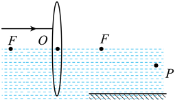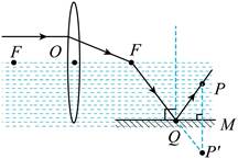 26. 如图所示,凸透镜的主光轴与水面重合,F是凸透镜的焦点,水下有一块平面镜M,一束与水面平行的光线经凸透镜折射后进入水中,再经水中的平面镜反射后恰过P点,请将光路图补充完整。