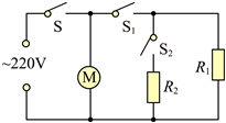 30. 某电吹风的简化电路图如图所示,R1、R2是电热丝,M是电动机,开关S闭合,S1、S2断开时吹冷风,通过电动机的电流为0.5A;S、S1闭合,S2断开时吹温风,R1的阻值为110Ω;S、S1、S2均闭合时吹热风,电吹风的总功率为1100W。求: