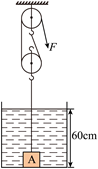 14. 用如图所示的装置匀速提升浸没在容器底部的正方体物块A,物块A的质量为5kg,棱长为10cm,水的深度为60cm。物块A露出水面前滑轮组的机械效率为80%,在水中上升的时间为5s。物块A与容器底部未紧密接触,水对物块A的阻力、绳子的重力、绳子与滑轮间摩擦都忽略不计,
