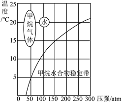 方法三:开发可燃冰。可燃冰的主要成分是甲烷水合物,甲烷水合物能稳定存在的压强和温度范围如图所示。可燃冰一旦离开海床便迅速分解,容易发生井喷意外,还可能会破坏地壳稳定平衡,引发海底塌方,导致大规模海啸,所以可燃冰的开采困难。