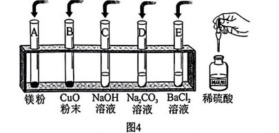 (1)将稀硫酸分别加入图4的试管中,无明显现象的是__________________(填字母序号),要证明该试管中已发生了化学反应,以下方案可行的是_________________(填数字序号)。