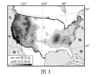 图3示意美国本土地震危险程度的分布,颜色越深代表地壳运动越活跃,危险程度越高。读图完成下面小题。