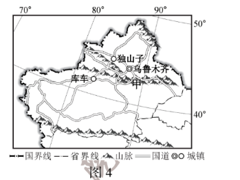 新疆独库(独山子—库车)公路连接北疆和南疆,全长约561千米,一半路段在海拔2000米以上。夏季,该公路是深受自驾游爱好者青睐的景观大道。图4示意新疆独库公路地理位置,读图完成下面小题。