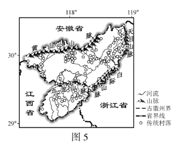 古徽州是我国传统村落保存最完整的区域之一。图5示意古徽州传统村落的分布,读图完成下面小题。