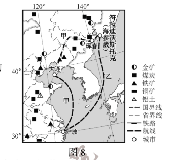 图8示意吉林省珲春到浙江省宁波的甲,乙两条运输路线,读图完成下面小题。