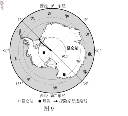 26. 南极地区自然环境独特、自然资源丰富,是开展科学考察和探险的宝地。2019年,我国某探险家拖拽约180千克物资,以越野滑雪的方式成功抵达南极点。图9示意南极地区,读图完成下列问题。