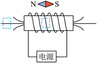 19.如图所示,请根据通电螺线管上方小磁针静止时的指向,在虚线框内用箭头标出相应的电流方向和磁场方向。