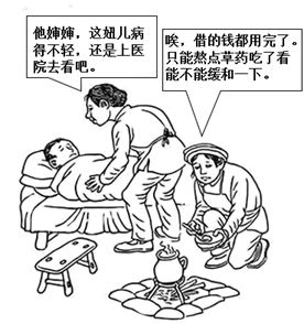 ▲那时农民就医,因缺钱致使很多患者无力进医院。 | ▲现在国家建立了城乡居民基本医疗保险制度,极大地减轻了患者的经济负担。 |