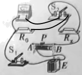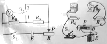 24. 某中学的物理课外实验小组,用如图所示的电路来测量待测电阻Rx的阻值。其中,R0为定值电阻(R0=10Ω),V为电压表,S1为单刀开关,S2为单刀双掷开关,R为滑动交阻器,E为电源,采用如下步骤完成该实验: