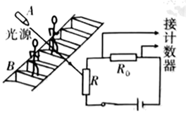 26. 如图为某商场安装的光敏电阻自动计数器的示意图。其中,A为点光源,B为匀速运行的自动扶梯,电源的电压为6V,R为光敏电阻,R0为定值电阻(R0=15Ω),R0两端接计数器。当点光源的光照射在光敏电阻上时,光敏电阻R=R0;当扶梯上有顾客通过,挡住由点光源射向光敏电阻的光线时,R的电阻值就增大,计数器则计数一次。